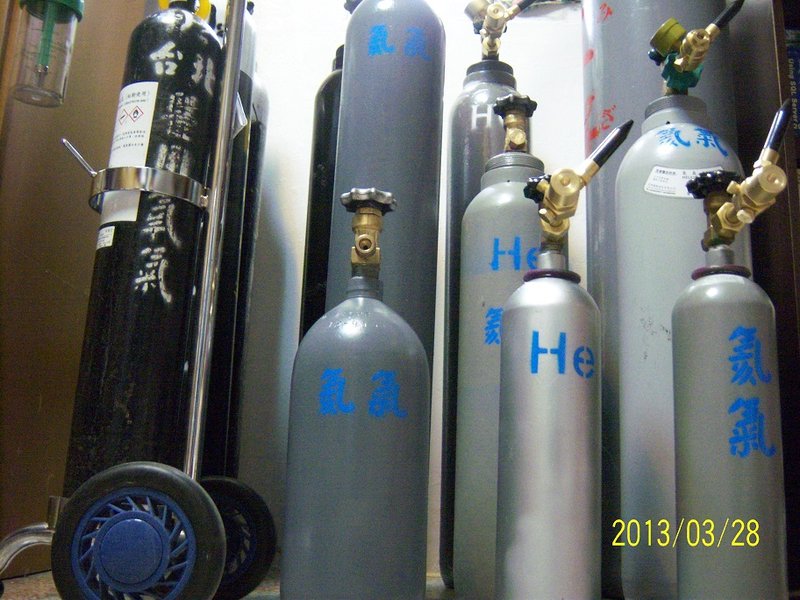 2公升鋼瓶, 內灌氣球級氦氣可充約20個十吋氣球, 直徑34公分的圓餅球約7個. 氦氣350元(未稅), 鋼瓶及專業的減壓充器頭押金3000元, 一週內還, 每晚一日扣30元.
